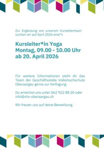 Zur Ergänzung von unserem Kursleiterteam suchen wir auf April 2026 eine*n Kursleiter*in Yoga. Die Stunde findet jeweils Montags von 09.00 – 10.00 Uhr statt. Für weitere Informationen steht dir das Team der Geschäftsstelle Volkshochschule Oberaargau gerne zur Verfügung. Du erreicht uns unter 062/ 922 88 20 oder info@vhs-oberaargau.ch